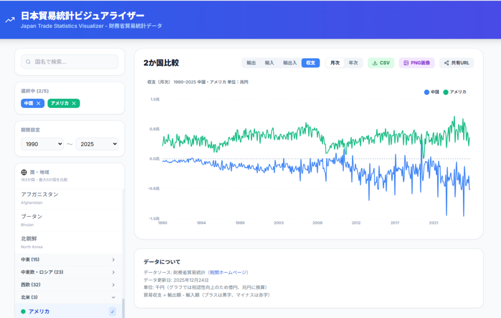 財務省が公開する貿易統計データをもとに、輸出・輸入・輸出入・貿易収支の推移を、国別にグラフ化し比較できる「日本貿易統計ビジュアライザー」を制作しました。期間(開始年/終了年)や月次/年次の切替、国の複数選択による比較表示に対応し、数値はツールチップで確認できます。また条件を含んだ共有URLの発行、CSVダウンロード、PNG保存にも対応しているため、授業・自学・ニュースの裏取り・簡易分析・資料作成など、実務的な用途にも使いやすいと思います。私の更新頻度だけが懸念点です。