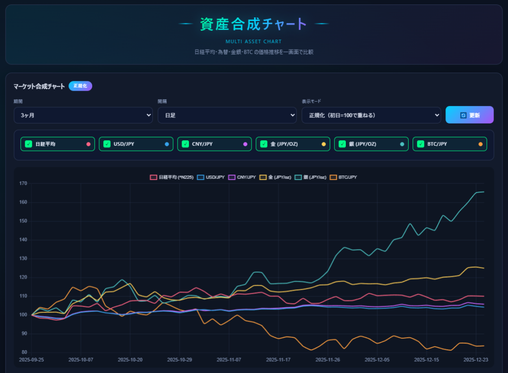 日経平均・為替・金銀・BTC の価格推移を一画面で比較できる「資産合成チャート-