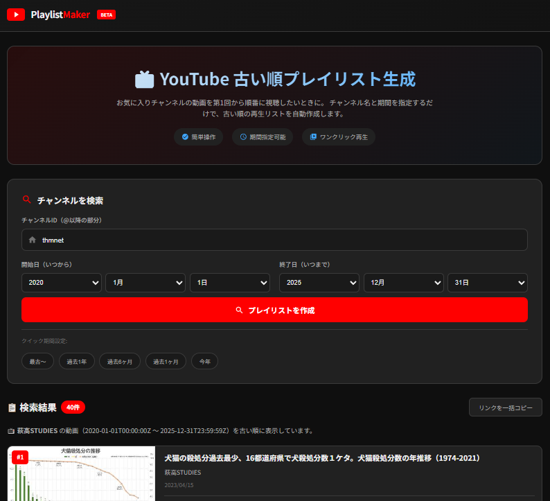 Youtubeのお気に入りチャンネルの動画を第1回から順番に視聴したいときに使える、 チャンネル名と期間を指定するだけで、古い順の再生リストを自動作成するYoutubePlaylistMakerを更新しました。これまでの古い順に並べ替えるロジック「list=UL01234567890」から watch_videos?video_ids=」(公式サポート)へ変えたので、以前よりは安定して使用できると思います。ただYouTube APIを使用していますので、1日の使用量上限に達すると一時的に利用できなくなります。そこはご了承ください。