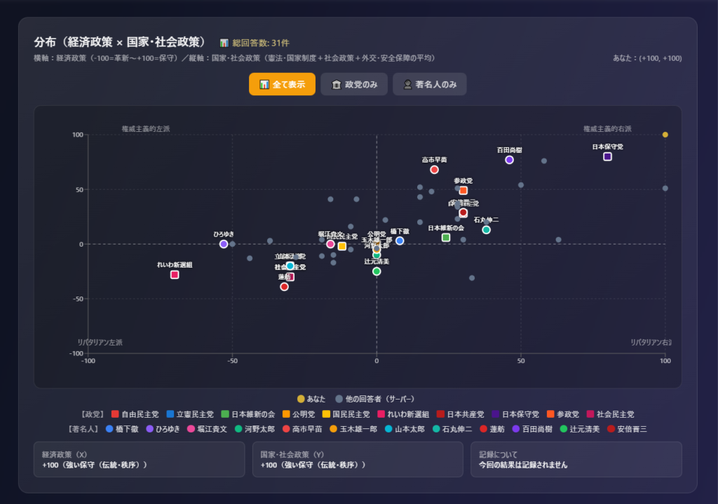 政治・社会・国家制度などのテーマについて、単純な「正解・不正解」やラベル付けを行うのではなく、価値観の方向性や思考のバランスを数値化・分布化して示します。散布図では著名人の思想位置も分析して配置しているのも特徴です。