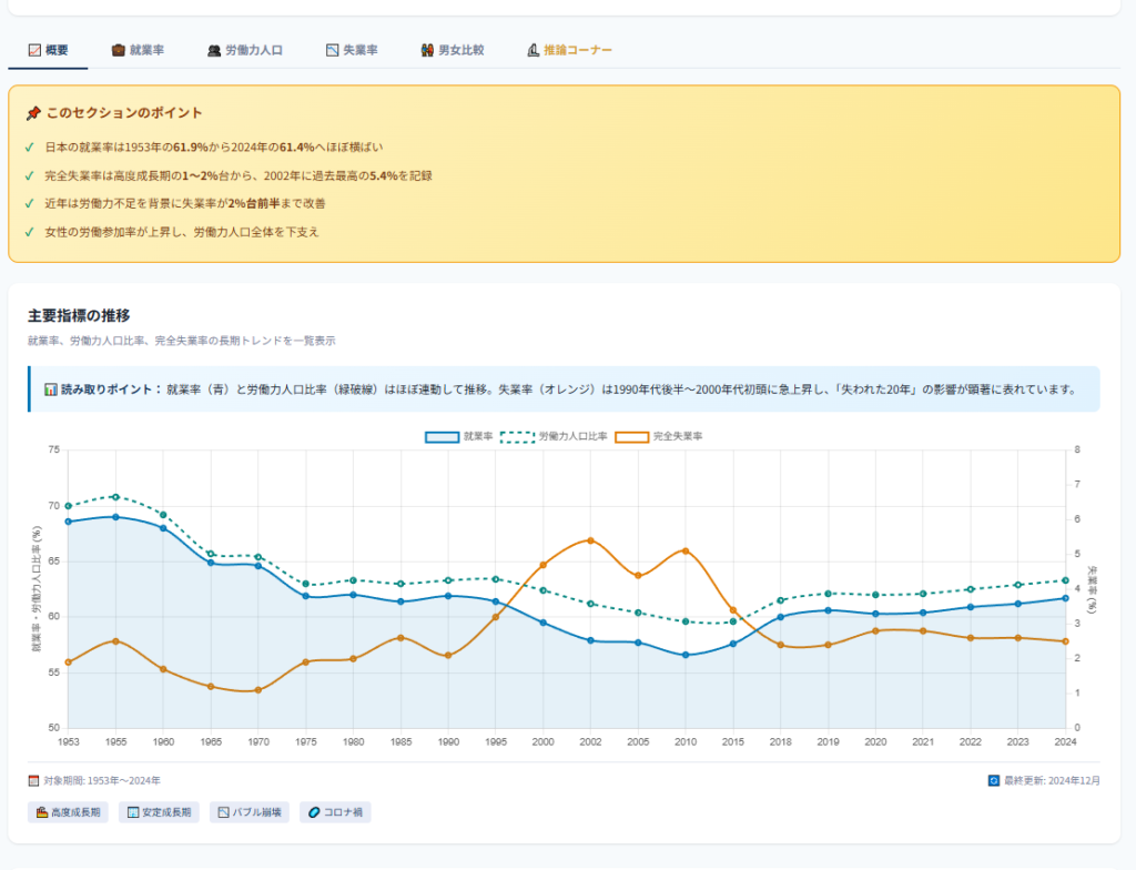 本サイトでは、総務省統計局が公表している労働力調査をもとに、就業率・完全失業率・労働力人口などの主要指標を、できるだけ直感的に確認できるようにしています。単年度の数値を見るだけでなく、1950年代から現在までの長期推移を一つの画面で追えるだけでなく、男女別・年代別といった切り口でリアルタイムに反映、比較できるのが特長です。